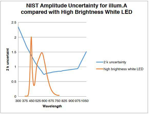 這造成在使用A光源作為校準源時產生不確定性。 大多數設備都以A光源為參考,但是典型的非A光源的光源的測量不確定性相對較高,并且儀器間一致性也會受到影響。 因此,大多數電子顯示測量都不是基于A光源的。