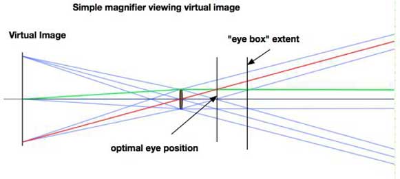 上面的這個眼盒(eye box)例子是一個簡單的放大鏡,真實物體放在鏡頭焦平面的前面。光線軌跡顯示虛擬圖像是在真實物體后面形成的。必須執行第二次光軌跡,才能知道觀察者將如何看到圖像的。