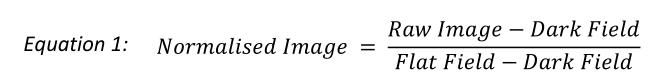 使用ImageJ軟件對圖像記錄并進行處理,對每一個數(shù)據(jù)組、平均暗場信號、平場校正信號以及樣品成像進行編譯。首先從一組參考的背景圖中獲取出平均背景信號;為了估算出平場信號,我們從每一個平場信號中減去平均背景,平場信號減去背景而后進行歸一化和平均處理這樣就可以得到平均平場校正信號;為了得到有效的目標信號,對所有的目標圖像進行背景扣除、歸一化處理而后除以平均平場信號。調(diào)整對象堆棧的大小可以改變相機曝光時間。通過將平均目標圖像除以平場信號,這樣可以使增益帶來的變化以及固定模式噪聲最小化【7,12】。最后處理得到的圖像再進一步分析。