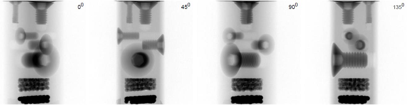 不同角度輻射成像:鋁材料覆蓋的M3-M8鈦螺絲、銅球以及硼硅球