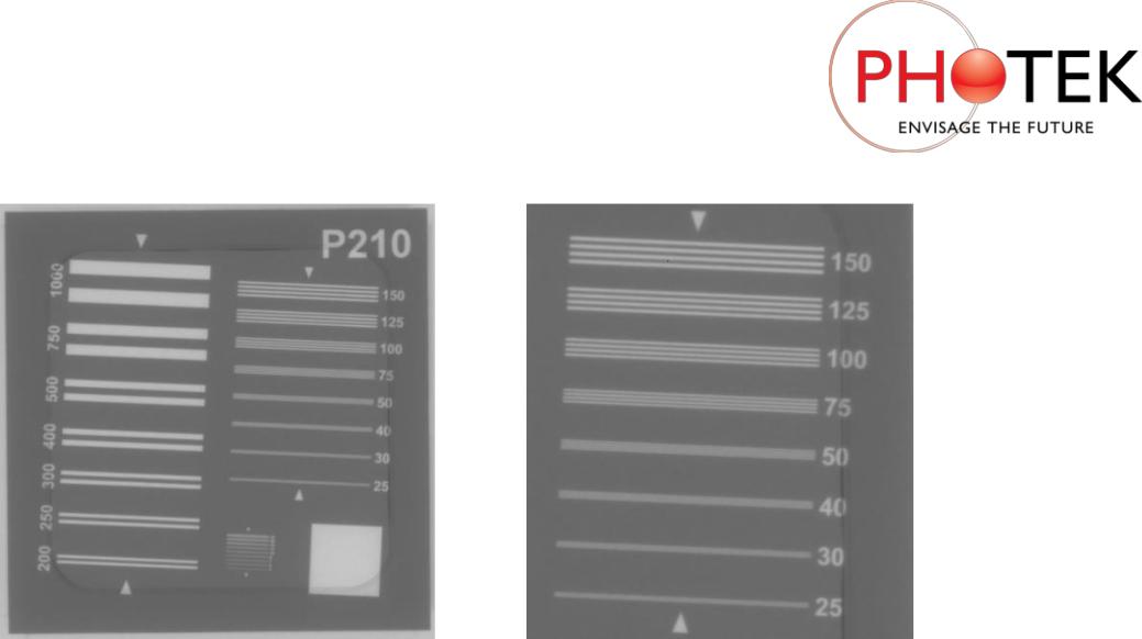 (a) 中心分辨率圖像 (75mm FOV) (b) 中心分辨率 (75mm 視場)線寬25-150µm