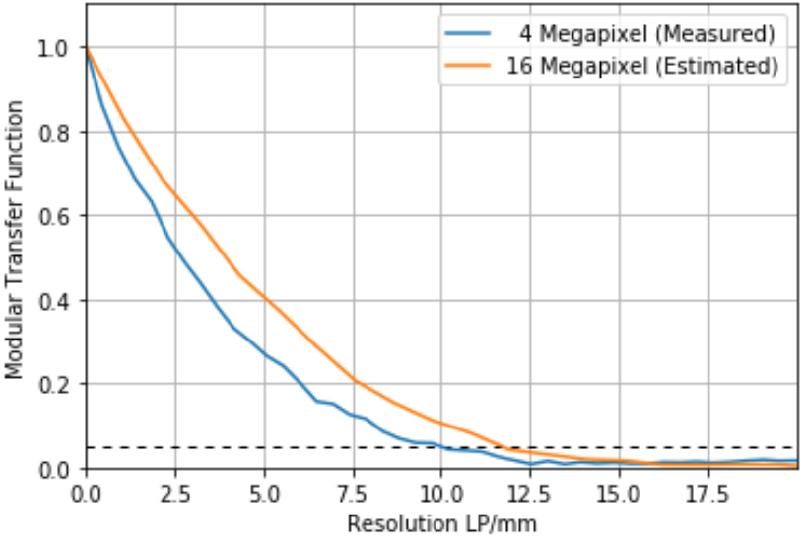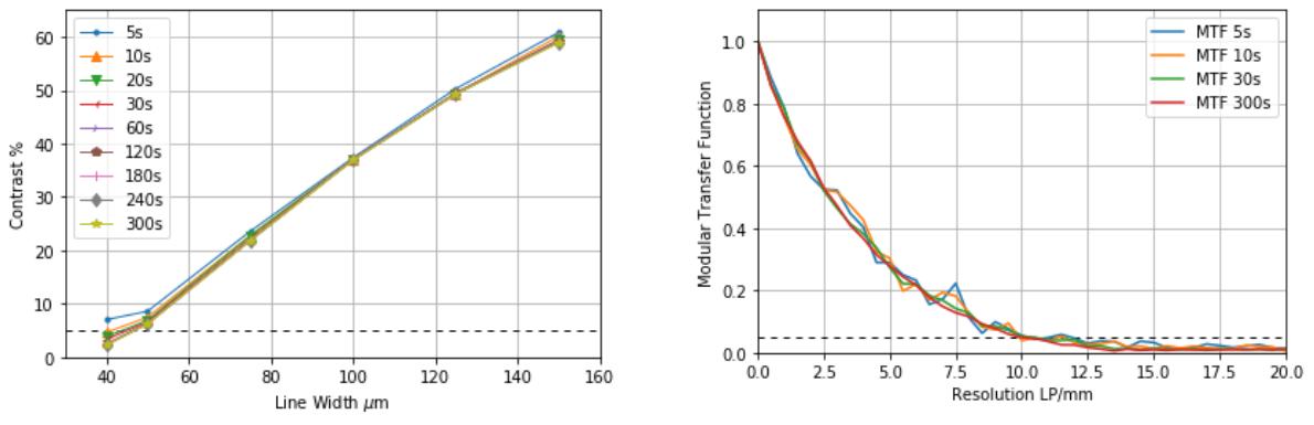 如圖5所示,將曝光時間從300秒減少到30秒不會影響測量的對比度或計算的MTF曲線。將曝光時間減少到30秒以下,測量對比度和計算的MTF曲線的趨勢相同,但引入了更多的噪聲,如圖6所示。然而,MTF曲線小于5%的點保持在9.5–10.5 lp/mm之間 。