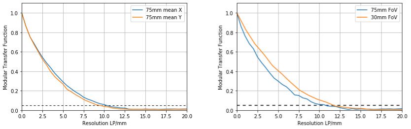 根據(jù)圖三得到的是300s積分情況下,75mm視場與30mm視場的中心成像區(qū)域的處理后的圖像,利用ImageJ測得的線輪廓,我們估算了30mm和75mm視場下,N-cam系統(tǒng)的極限分辨率(5%)分別是12.5lp/mm以及10lp/mm 。對于有效像素尺寸為38um的75mm視場,同時進行采樣處理(Nyquist),得到的極限分辨率為13lp/mm,和MCP175的16lp/mm分辨率結(jié)合分析,10lp/mm屬于合理的數(shù)據(jù)。對于有效像素尺寸16um的30mm視場,采樣處理后極限是30lp/mm,與16lp/mm像增強器結(jié)合得到12.5lp/mm與理論相差較大,當然這個數(shù)據(jù)還有其他我們沒有考慮到的影響因素,比如我們需要更詳細的測量來確定熒光屏對分辨率的影響。