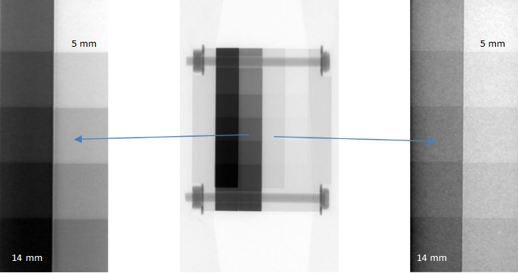 10a) Copper step-wedge from 5 to 14mm in 1 mm steps 10b) Contrast Phantom 10c) Aluminum Step-wedge from 5 to14 mm in 1 mm steps