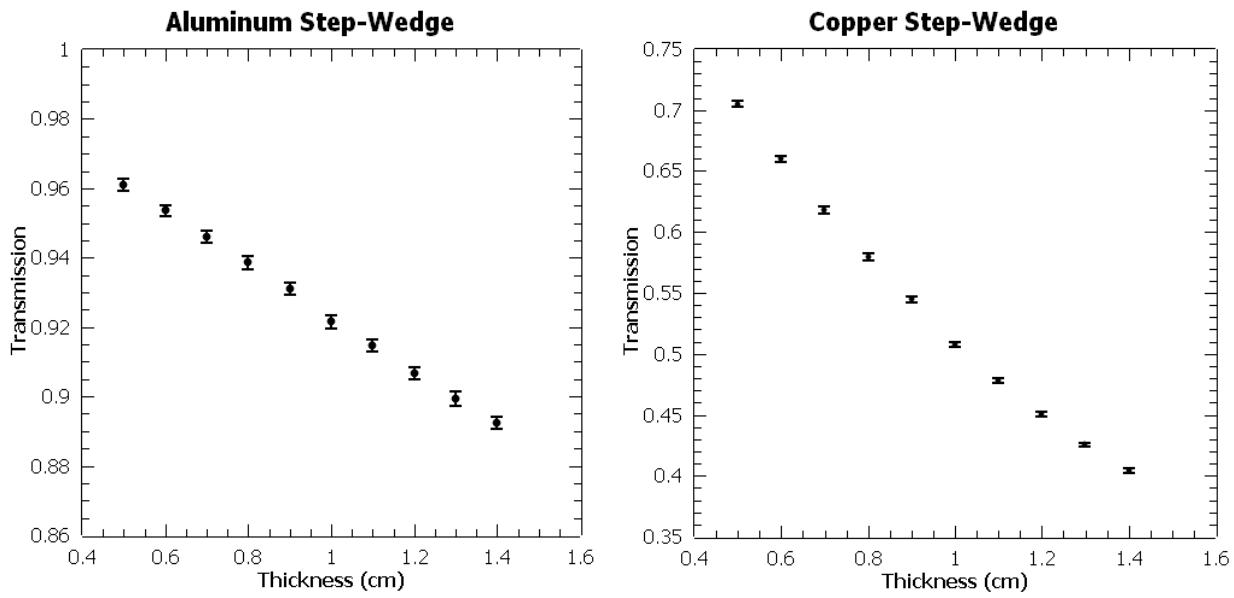 Figure 11a. Transmission through the copper step-wedge with error bars representing 1 σ noise.