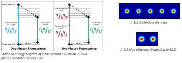 圖6.2 雙光子熒光原理示意(左);多焦點結構(右)