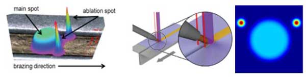 專門為這種工藝訂制的勻化器,可以在主焊的平頂光斑前端兩側產生兩個小光斑用于待焊金屬的清洗和加熱,提升釬焊的強度和焊縫的整潔度。