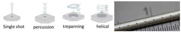 激光鉆孔利用聚焦的重復脈沖激光器汽化金屬,形成通孔。脈沖能量越大則汽化的金屬越多。作為激光加工領域主流應用之一,多年來發展了各種打孔技術:單脈沖,叩擊,旋轉打孔,螺旋打孔等。激光打孔在多種場景應用,包括橡膠、硅襯底等。