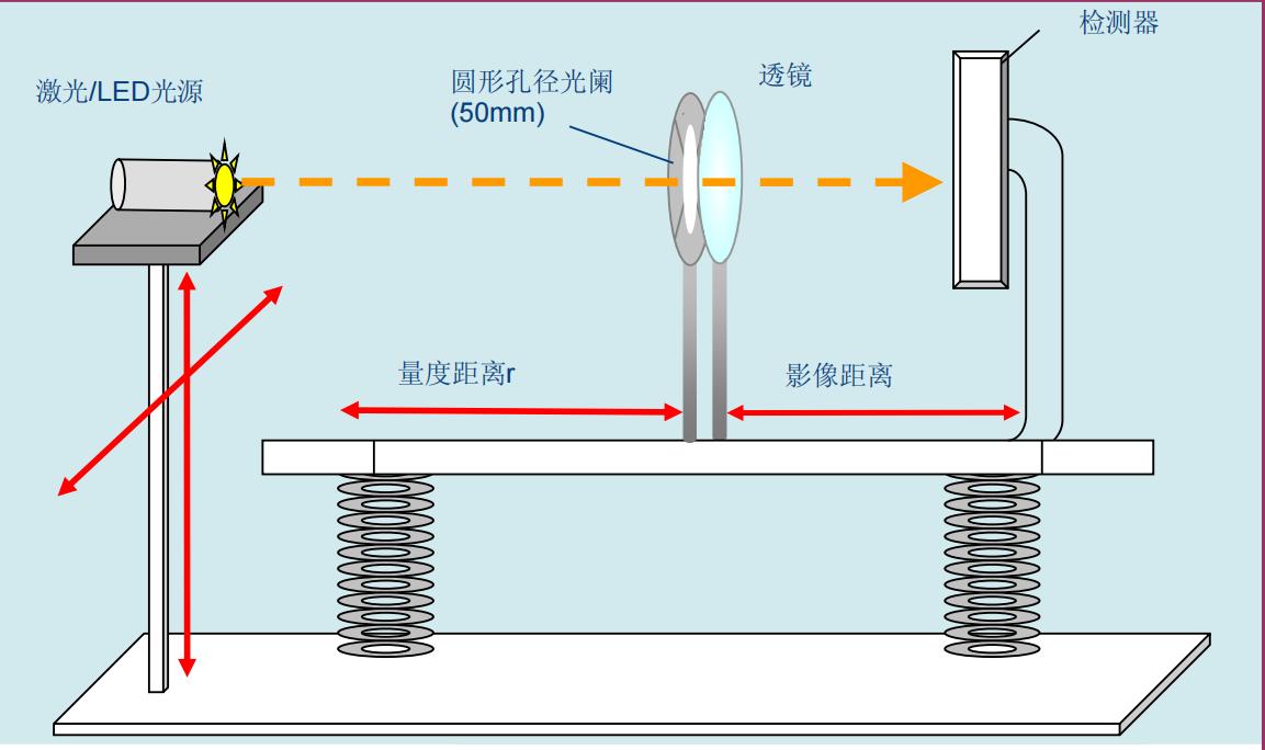 1. 將光源、透鏡、光闌、光斑儀等固定于產品測試架上,并將其與測量透鏡水平對齊,如下圖搭建好測試光路。