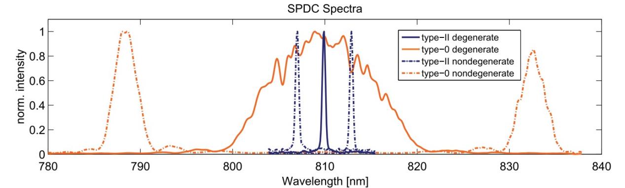 對于II型PPKTP的自發參量下轉換輻射過程,信號光和閑散光的偏振輸出是正交的,其群速度在波長簡并度上已經有明顯的差異,導致了相對較小的光譜帶寬,如果某應用需要相對窄的輸出光譜帶寬則可以考慮。