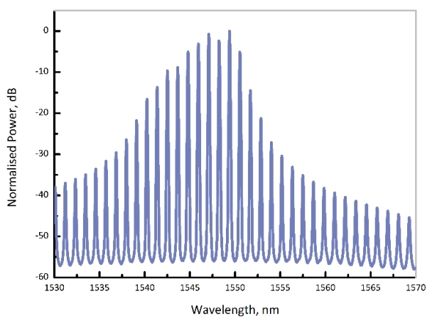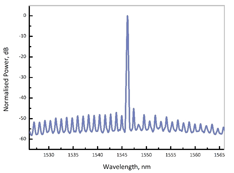 如前言,Eblana Photonics蝕刻出上述溝槽結構后,干擾并抑制了F-P激光器的幾乎所有縱模,而唯獨留下特定的一個縱模實現不受干擾的高增益(如圖4)。從而獲得了理想的單縱模窄線寬半導體激光輸出(如圖5)。