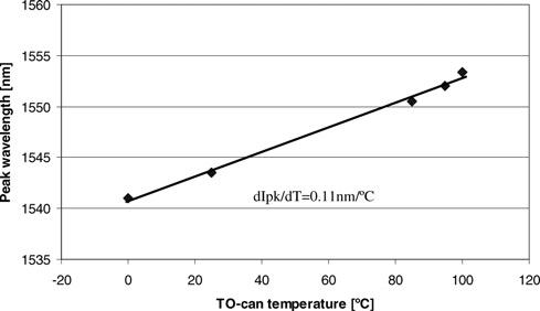 圖8.DMLD離散模半導體激光器在0-100度寬范圍調溫調諧波長1542-1553nm