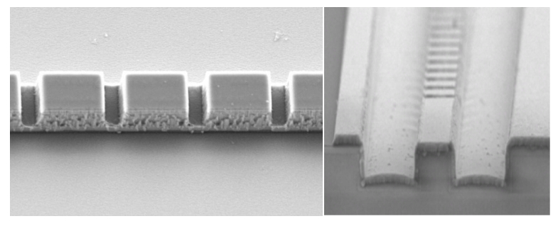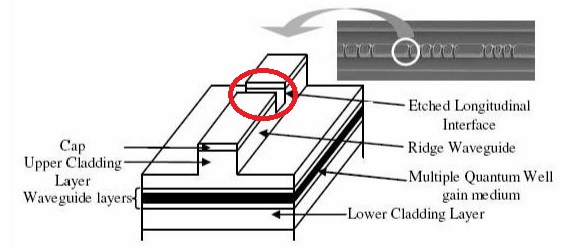 請參考(如圖1.)這是一個標準的F-P半導體激光器,Eblana Photonics公司擁有的這種離散模半導體激光器制備工藝,是在F-P半導體激光器脊波導上一系列特定的位置,刻蝕上特定間距和深度的溝槽(如圖2)。