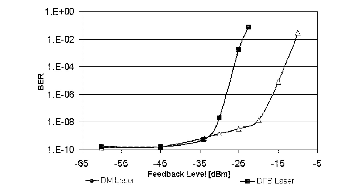 圖9. DM離散半導體激光器與DFB分布反饋半導體激光器對反饋干擾強度的允許度