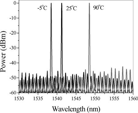 圖7. DMLD離散模半導體激光器在不同溫度下的輸出光譜,可見變溫條件下仍保持單模輸出且邊模抑制比好于40db