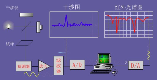 工作原理:光源發(fā)出的紅外輻射,經(jīng)干涉儀轉(zhuǎn)變成干涉圖,通過試樣后得到含試樣信息的干涉圖,由電子計算機采集,并經(jīng)過快速傅立葉變換,得到吸收強度或透光度隨頻率或波數(shù)變化的紅外光譜圖。干涉圖從數(shù)學(xué)觀點講,就是傅立葉變換,計算機的任務(wù)是進行傅立葉逆變換。