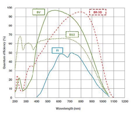FI:前感光CCD BV:背感光,可見波段優化 BU2:背感光,紫外增強250nm 優化 BR-DD:背感光深耗盡CCD。帶有消除近紅外波段的etalon 鍍膜 |
