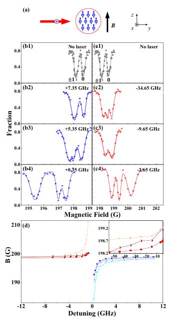 國內(nèi)關(guān)于Feshbach共振的研究也有許多,例如張婧、李東豪教授小組在實驗上成功實現(xiàn)了p波Feshbach共振技術(shù),利用激光實現(xiàn)束縛態(tài)的躍遷[9],如圖 3所示。而在聶亮、張越等人的工作中,成功實現(xiàn)了同核和異核Feshbach共振,為模擬量子流體等相互作用提供了理想的平臺[10]。