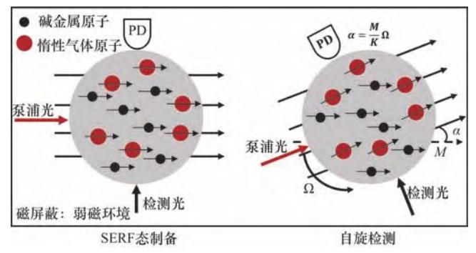 SERF原子自旋陀螺儀利用電子自旋敏感物體轉(zhuǎn)動,具有精度高、體積小的特點。其主要工作過程為原子SERF態(tài)制備以及原子自旋進動檢測。其工作原理如圖 6所示,磁屏蔽裝置使原子處于近零磁場環(huán)境中,此時堿金屬原子的拉莫爾進動頻率大幅降低,同時由于高密度高壓環(huán)境使自旋交換率極大提升,從而充分抑制原子的自旋交換弛豫,實現(xiàn)SERF態(tài)。當載體轉(zhuǎn)動時,由于電子自旋的定軸性,檢測激光與電子自旋產(chǎn)生的宏觀磁矩M間存在夾角α,通過檢測該角度即可得到載體轉(zhuǎn)動信息。