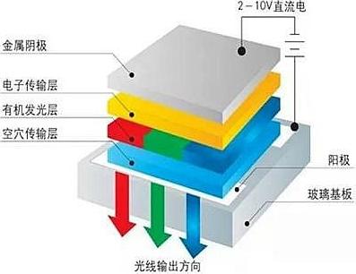 OLED是自發光顯示技術,由一層有機化合物圖層和上下電極構成,通電后有機物被電流激發出彩色光并形成圖像。OLED器件結構: