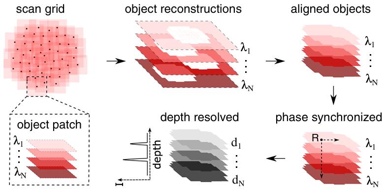 圖4、POCT重建流程。首先對(duì)每個(gè)波長(zhǎng)進(jìn)行單層ptychographic重建,然后通過縮放和配準(zhǔn)對(duì)所有重建圖像進(jìn)行對(duì)齊,并使用合成參考信號(hào)進(jìn)行相位同步。最后,通過傅里葉變換揭示深度分布[Optics Letters, Vol. 46, No. 6, 1337 (2021)]。