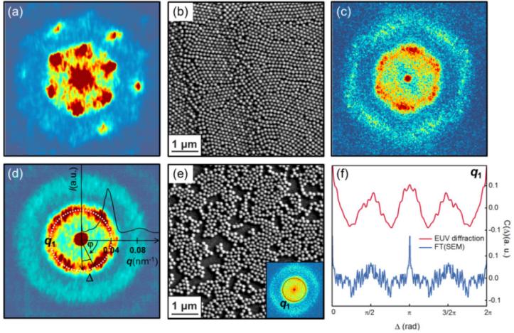 圖2、不同對(duì)稱性二氧化硅納米球晶格的相干極紫外散射。(a, d) 不同樣品區(qū)域的極紫外布拉格衍射圖,(b, e) 用極紫外布拉格相干衍射探測(cè)的樣品掃描電子顯微鏡圖像。(c 和 e 的插圖) 分別為 (b) 和 (e) 的傅里葉變換的平方振幅所得到的模擬結(jié)果。(f) 比較了 (d) 樣品的極紫外相干衍射圖和 (e 的插圖) 掃描電子顯微鏡圖像區(qū)域的模擬結(jié)果之間的互相關(guān)函數(shù)。兩條曲線的四重周期性表明,在確定該樣品區(qū)域的晶格對(duì)稱性方面,兩者具有定性一致性。[OPTICS EXPRESS, Vol. 26, No. 9,11399(2018)]