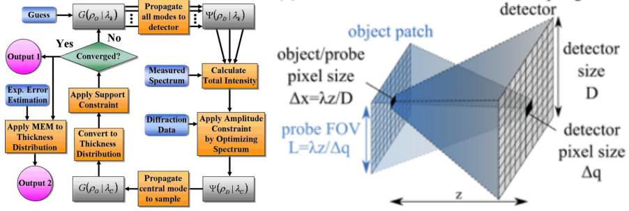 圖1、左:多波長(zhǎng)CDI的算法工作流程[Physical Review A 79, 023809(2009)]。右:ptychography中的采樣要求,像素大小 ?x和視場(chǎng)L,假設(shè)弗勞恩霍夫或菲涅耳衍射[Optics Express, Vol. 30, No. 3, 4133(2022)]。