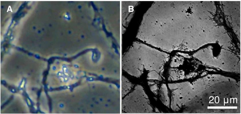 圖3、光學(xué)圖像與極紫外(EUV)圖像的比較。圖中顯示了培養(yǎng)7天的神經(jīng)元樣本:(A)固定后樣本的白光相襯顯微鏡圖像;(B)固定后樣本的疊層衍射成像(ptychography)29 nm(43 eV)極紫外(EUV)強(qiáng)度透射圖像。極紫外成像提供的額外細(xì)節(jié)和分辨率從較粗束周圍精細(xì)結(jié)構(gòu)的可見性中可以立即看出[Sci. Adv. 2020; 6 : eaaz3025 1 May 2020]。