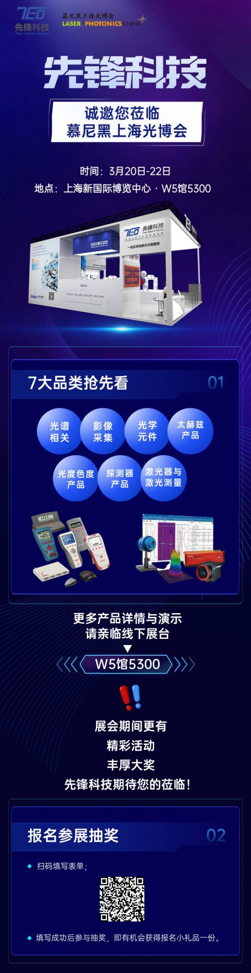 展品涵蓋光譜產品、紅外相機、像增強器、手持式光譜亮度計、激光光束測量儀、波長計、激光功率能量計表頭、探頭、X射線探測器、黑硅探測器、氣體傳感器等熱門產品,屆時歡迎新老朋友蒞臨先鋒科技展位【W5館5300】參觀交流。