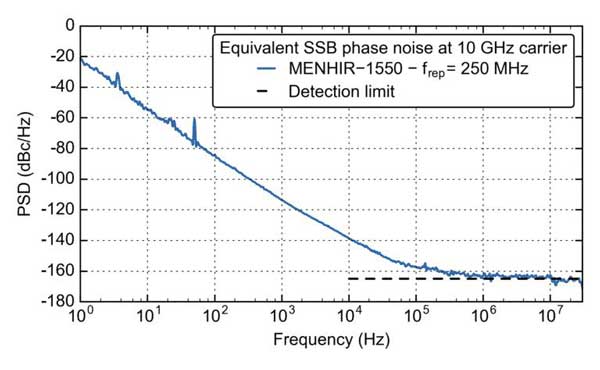 Menhir Photonics 為這種應用提供極低位相噪聲、高可靠度的鎖模激光器。圖1展示了250MHz重復頻率的MenHIR-1550 的典型位相噪聲。相位噪聲在10GHz載波(40階諧波)上測量。噪聲本底給出的累積時間抖動上限越為500as(阿秒)。