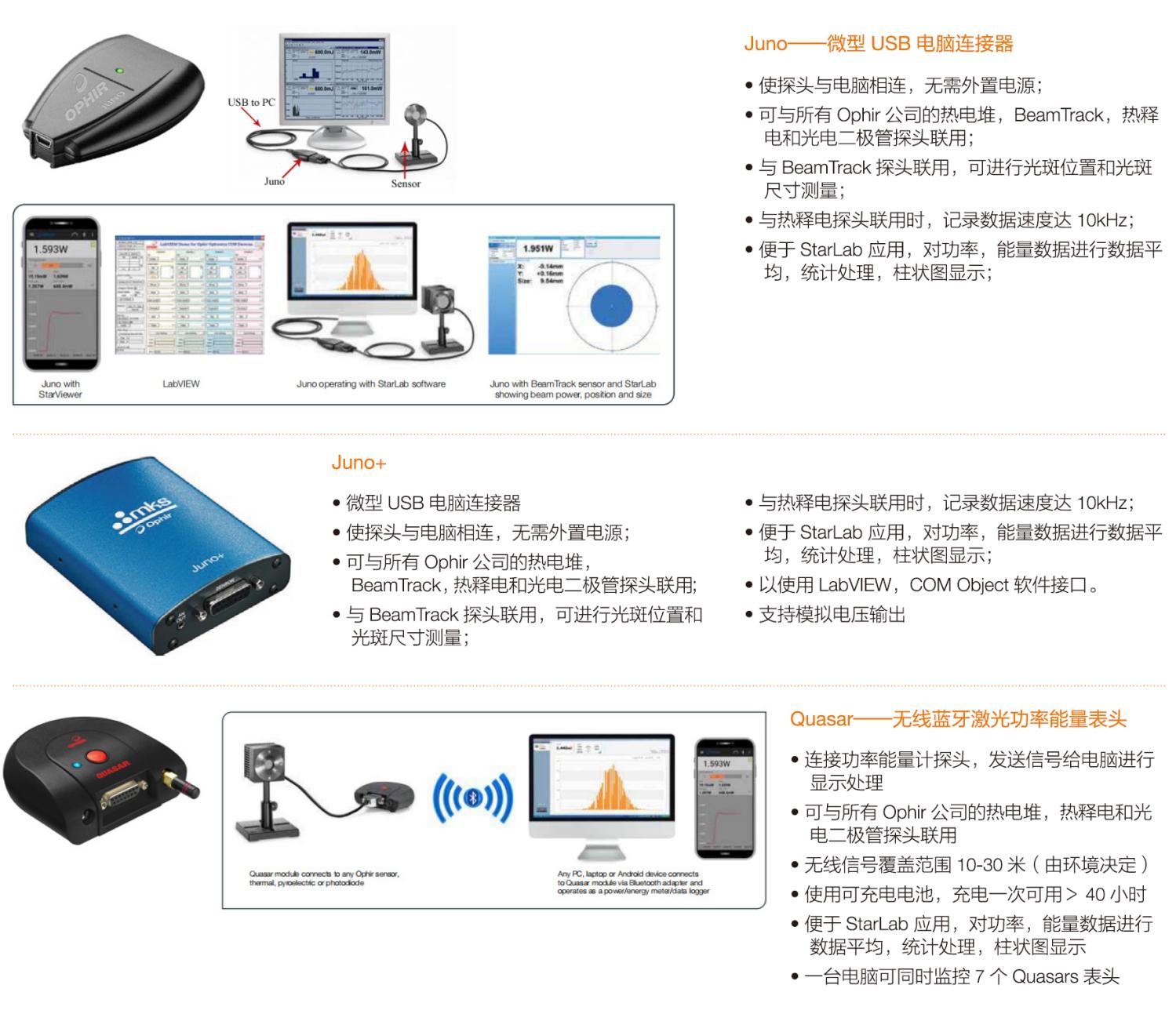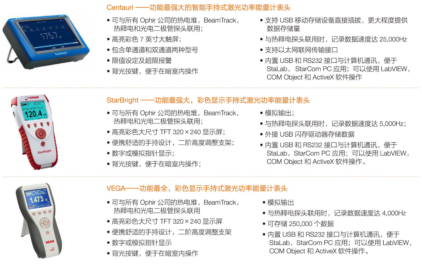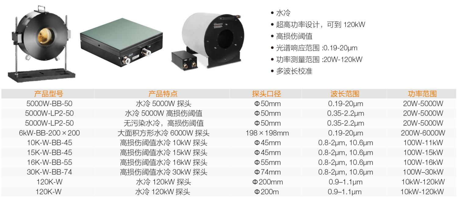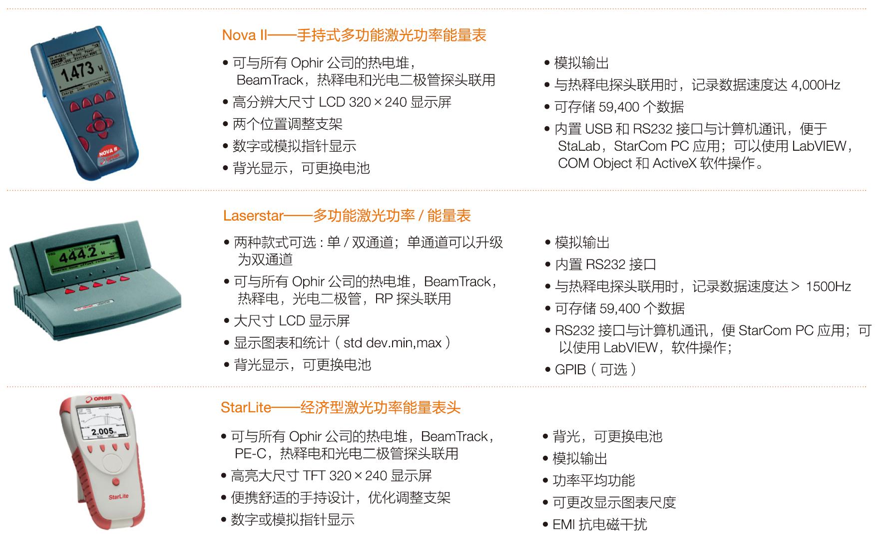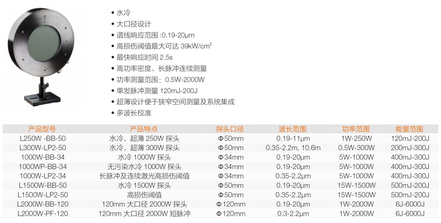 綜上所述,使用Ophir功率計在高功率光纖激光器測試中具有高精度、多功能、實時監測和數據分析等優勢,能夠有效提升產品質量保證和性能評估的準確性和可靠性。這對于制造商和用戶來說都是一種有力的支持,有助于推動激光技術的應用和發展。下面,是對于高功率光纖激光器生產廠商常用的功率計探頭和表頭參數上面的介紹和列舉: