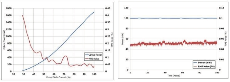左圖, Ventus 532 藍(lán)線為輸出功率, 紅線為RMS 噪聲隨二極體泵浦源驅(qū)動(dòng)電流的變化圖右圖, Ventus 532 出光100 個(gè)小時(shí)后的輸出功率( 藍(lán)線) 及噪聲