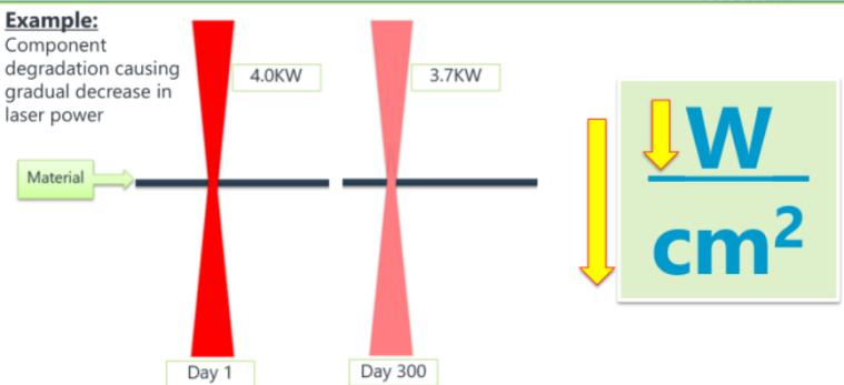 隨著使用時間的增加,實際切割或者焊接的時候會發現質量變差,最直接的體現就是在同樣激光參數設置下,樣品不能被切割開或者焊接變差出現虛焊等現象,這個是由于激光功率變化造成的,功率下降后最終在樣品工作點位置功率密度下降造成的,此時需要調節激光參數從而達到最初設置;