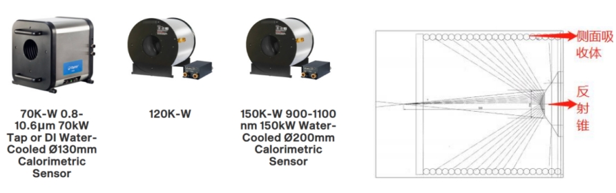 超高功率測試功率計:采用熱電堆吸收,通過測試水溫變化從而做到高達150kW激光功率的測試。超大口徑,安全無背向散射,可多向操作等特性,是超高激光器功率的測試最優選擇;