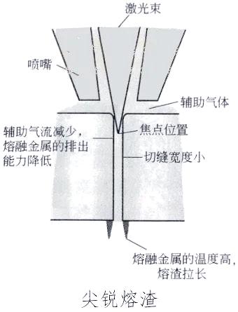 當焦點位置調整不當,導致切縫過窄時,會出現掛渣呈尖狀,難以清除,同時切割面錐度較小,使得工件難以取出。