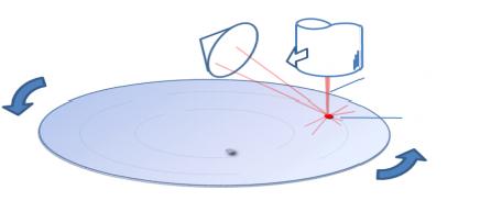 如圖一.激光光束經過聚焦鏡以一定的傾斜角照射到晶圓表面,大部分激光會發生鏡面反射然后被人工放置的激光吸收器(damper)吸收,小部分會被晶圓表面吸收,極小部分會向各個方向散射。我們在垂直的方向放置一個探測器檢測散射光的強度,通過晶圓的高速旋轉疊加徑掃描實現對于晶圓上所有點的檢測。正常狀態下探測器檢測到的是微弱的散射本底,向而當激光光束掃描照射到晶圓上的瑕疵時,由于瑕疵點的微區散射率會小幅度直至大幅度的增加,探測器輸出的信號強度也會等比的變化,以此我們實現了晶圓上瑕疵點的掃描檢測。