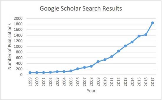 圖1:每年提及“氮空位”和“金剛石”的出版物總數(Google Scholar)。