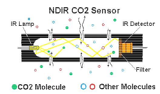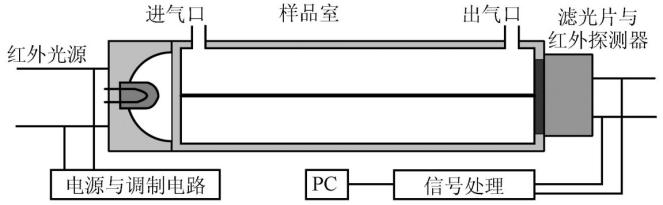 整個系統一般包括紅外激發光源、樣品腔、紅外探測器。同時,因為NDIR通常使用的探測器對光強的變化敏感,而對光的絕對強度不敏感,通常需要使用一個調制紅外光源。紅外光源通過微處理器來脈沖式開和關,使其發生不連續的紅外輻射。