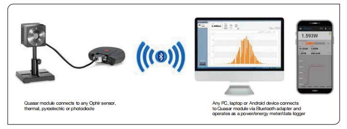 Quasar 無(wú)線(xiàn)藍(lán)牙激光功率能量表頭連接功率能量計(jì)探頭,發(fā)送信號(hào)給電腦進(jìn)行顯示處理