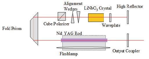 調Q 激光器大多數采用Nd3+ 作為增益介質,主要工作波長為1064nm(Nd:YLF 為1053nm);因調Q 激光器峰值功率一般較高,可以較為方便的通過非線性晶體進行頻率轉換,實現532nm(527nm)、355nm(351nm)、266nm(263nm)、213nm 等諧波,并可通過參量過程轉換成其他波長。