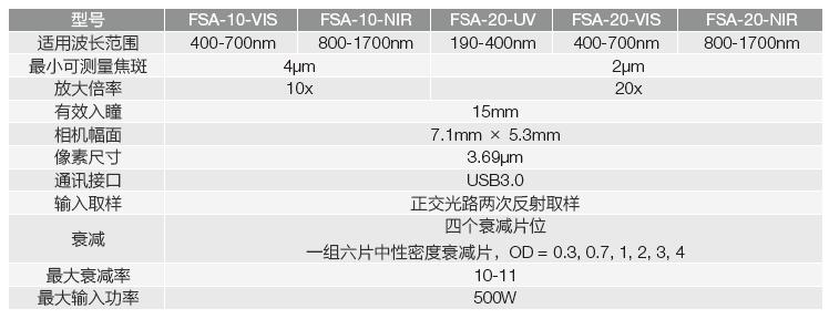 根據不同的應用場景,焦斑分析儀分為常規FSA 系列、組合式FSA-M 系列、折疊光路FSA-F 系列三個系列,10x、20x 兩種放大倍率和UV、VIS、NIR 三種波段范圍產品。