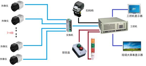 熱像儀通過交換機連接到工控機網口,掃碼槍連接到工控機485接口,按鈕盒柱燈連接到工控機I/O板,工控機連接兩個顯示器。
