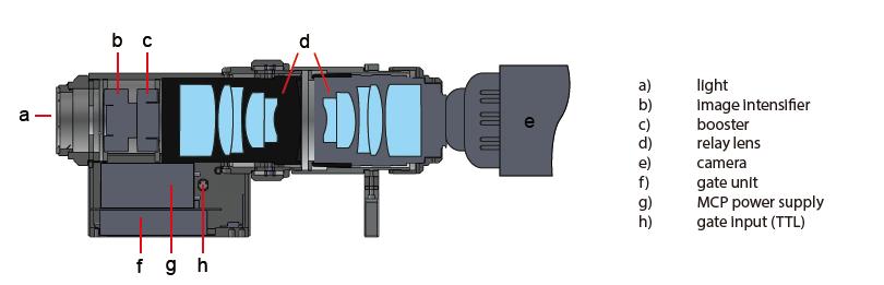 Hi CATT的像增強器是混合的,含有兩級,直徑可以是25mm或18mm。前一級是二代或是三代管的MCP像增強器,可以提供很高且可調(diào)的增益。第二級是一個一代管的增強器(booster),可以在高幀率的情況下增強成像強度。在門控模式下,第一級可以作為納秒兩級的光電開關(guān)。像增強器的工作頻率在Burst模式下可以到2.5MHz