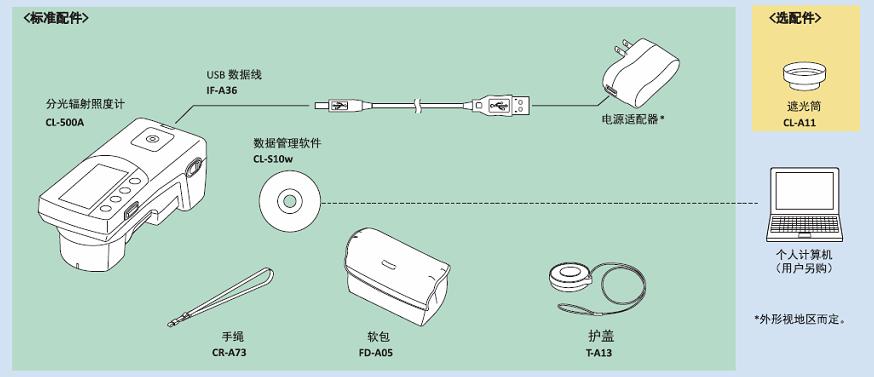 護蓋(T-A13)、軟包、USB數據線、電源適配器、手繩、數據管理軟件(CL-S10w)、CL-500A專用軟件開發工具包(CL-SDK) |