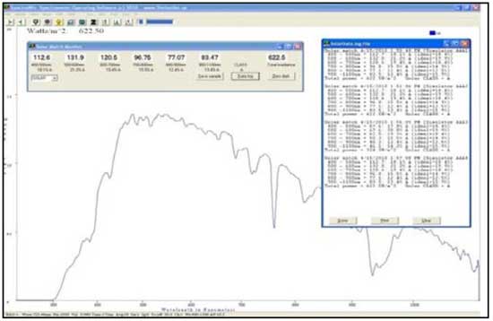 系統自帶的SpectraWiz®光譜學軟件內置專用于太陽光譜測試的應用程序,可用于表征太陽模擬器的參數。Solar Match用于監視計算光譜輻照度:400-500nm,500-600nm,600-700nm,700-800nm,800-900nm,900-1000nm,1000-1100nm,可將每個范圍依據IEC/JIS/ASTM的理想百分比符合情況出具比較結果。這個測量的結果常用于太陽模擬器燈A-D的分類。SpecTracWiz軟件還內置了用于UV監測、PAR計算等更多功能的應用程序。以及將全光譜保存到文件或數據日志、時間序列分析的功能。