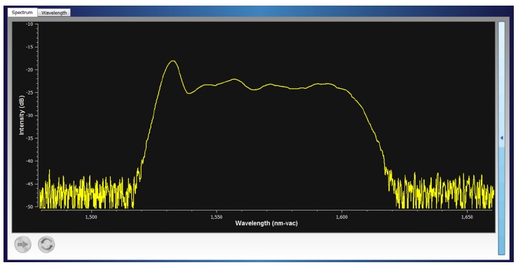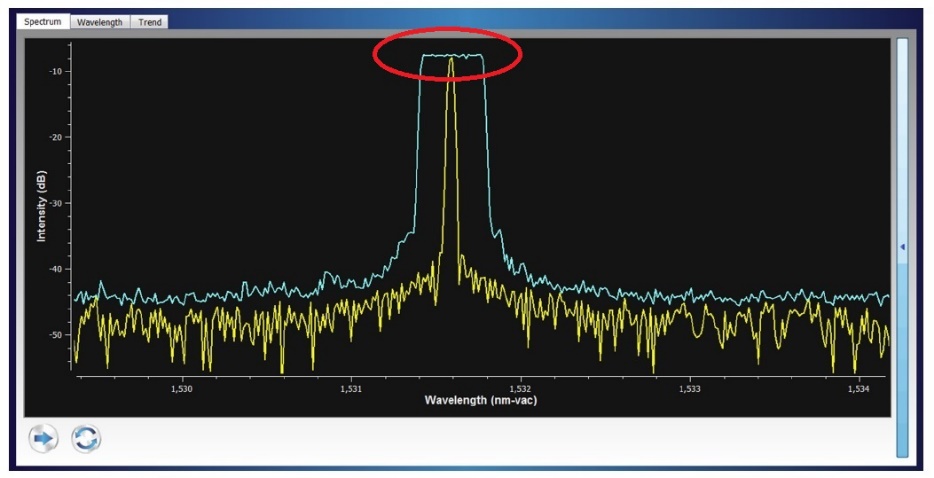 如圖五所示,黃色譜線是最近一次采樣的激光頻譜,藍色譜線為伴隨著波長調諧做多次激光頻譜測試的包絡線,所以藍色譜線的上沿平頂部分是分布反饋激光器在調變激光波長后掃描下的激光主模波長調諧的軌跡。無論對于科研用戶還是系統整機制造廠家,都是一個直觀評價可調諧激光調諧頻段的操作界面。