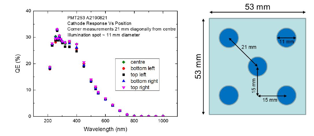 2.1 光陰極光陰極面積為28.1cm2,較之通常的像管尺,18毫米、25毫米或40毫米直徑大得多。我們使用了Photek生產(chǎn)的光度計(jì)來(lái)評(píng)估光陰極響應(yīng)的均勻性。該光度計(jì)使用寬帶紫外/可見(jiàn)/紅外光源和窄帶濾光片,光斑直徑為11mm。如圖1所示,分別測(cè)試5個(gè)不同的位置,然后進(jìn)行對(duì)比測(cè)試。