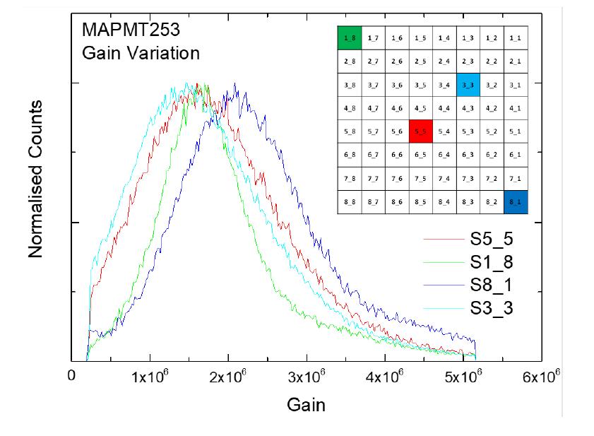 本文分析了這個(gè)新的MAPMT253的性能,其工作區(qū)域?yàn)?3X53mm,總共64X64個(gè)陽(yáng)極輸出。