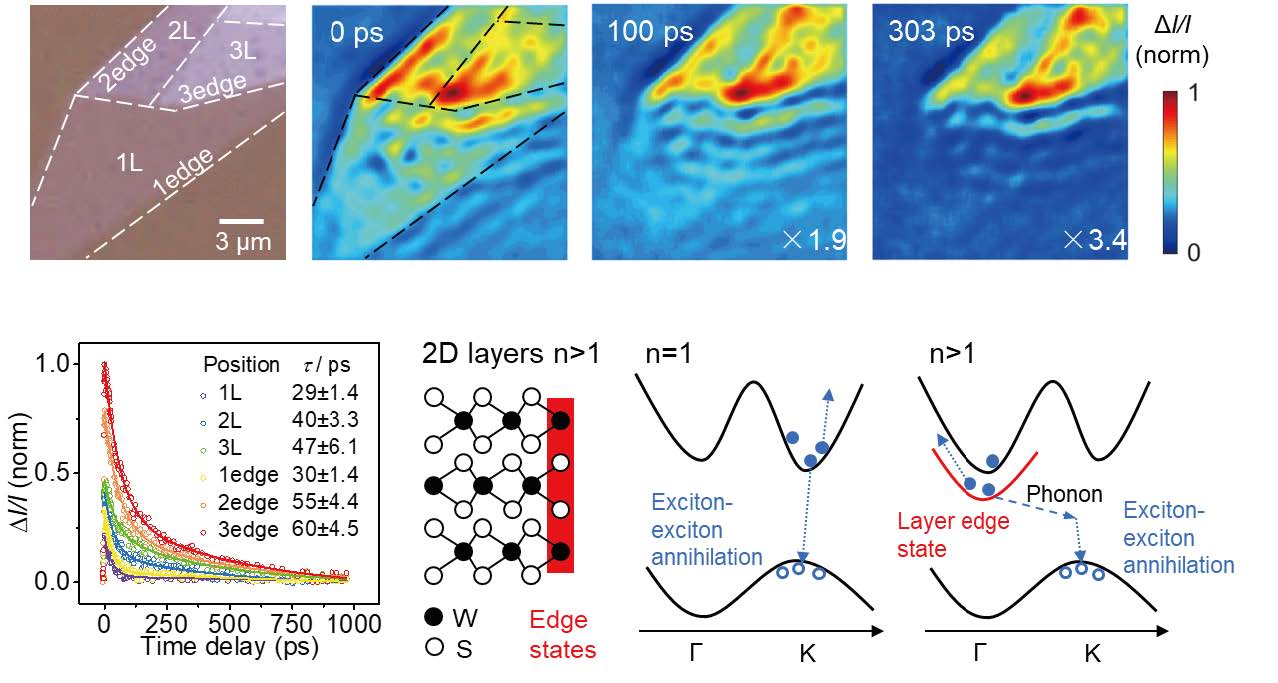 二維WS2中激子分布情況,激子壽命研究。可以看到,多層的邊緣具有更高激子密度和更長激子壽命