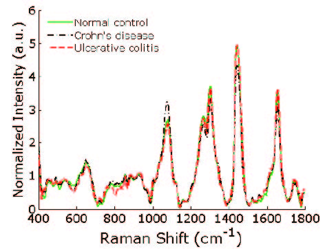 正常腸道組織,階段性腸炎,潰瘍性腸炎拉曼信號比對